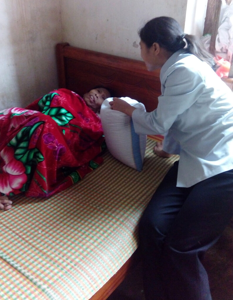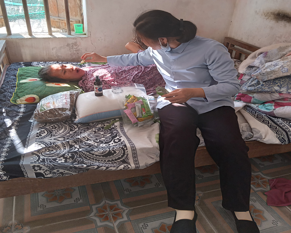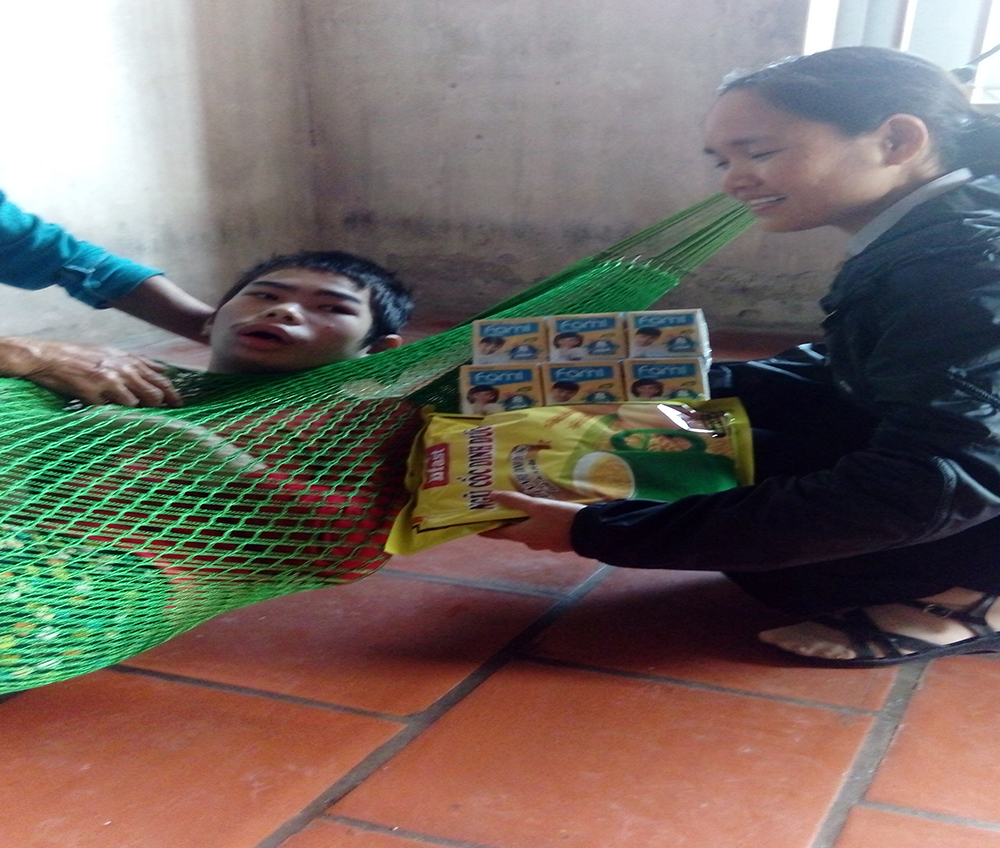 Bà bị liệt từ nhỏ, sống cùng người em gái sức khỏe yếu, bị chồng bỏ nhưng vẫn phải đi làm kiếm tiền để nuôi chị. Khi được hỏi nếu có thể nuôi con gì, bà chọn nuôi vịt để có thêm thu nhập mua bỉm cho chị. Các Sơ đã giúp bà 30 con vịt. - Chị Nguyễn Thị Huế (sinh năm 1985)