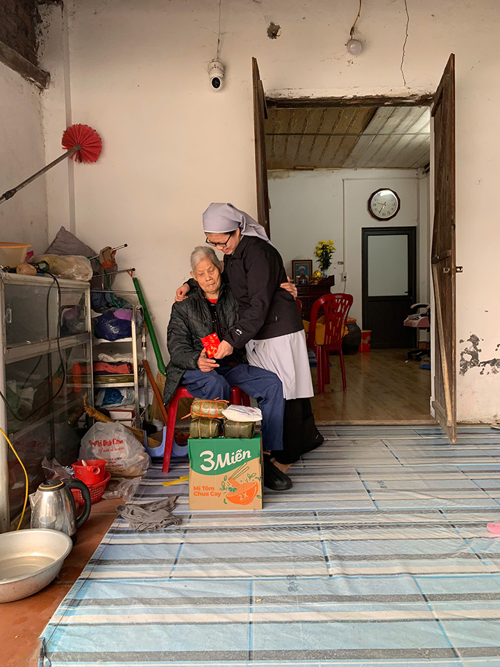 Dạ em thưa Chị T., trong dịp Tết Nguyên Đán năm nay, em đã trích 15 triệu đồng tiền tùy nghi, để thăm và trao quà tết cho một số người nghèo, người bị HIV, và người nhiễm chất độc màu da cam. Họ cảm động lắm ạ, nhất là những người bị nhiễm chất độc màu da cam, họ đã khóc và nói “Chúng tôi rất xúc động nghĩa cử yêu thương bên Công Giáo, xã hội không quan tâm đến chúng tôi còn bên nhà thờ lúc nào cũng đến thăm hỏi trao quà cho chúng tôi”.
