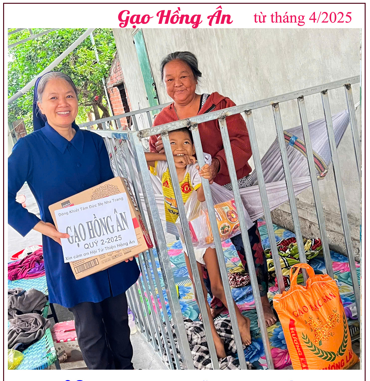 KT08 – NGUYEN VIET DUC 2017 Published 01/26/2026 at 1181 × 1216 in GẠO HỒNG ÂN: ÍT GẠO THÔI, NHƯNG THẬT QUÝ! Cháu Nguyễn Việt Đức (2017) *** Cháu Đức bị bại não, bị cha mẹ bỏ rơi. Cháu sống với bà nội già yếu, đang mắc bệnh viêm đa khớp nặng, không còn khả năng lao động. Hai bà cháu nương tựa vào nhau trong cảnh thiếu thốn, buồn tủi từng ngày. ← Previous Next →