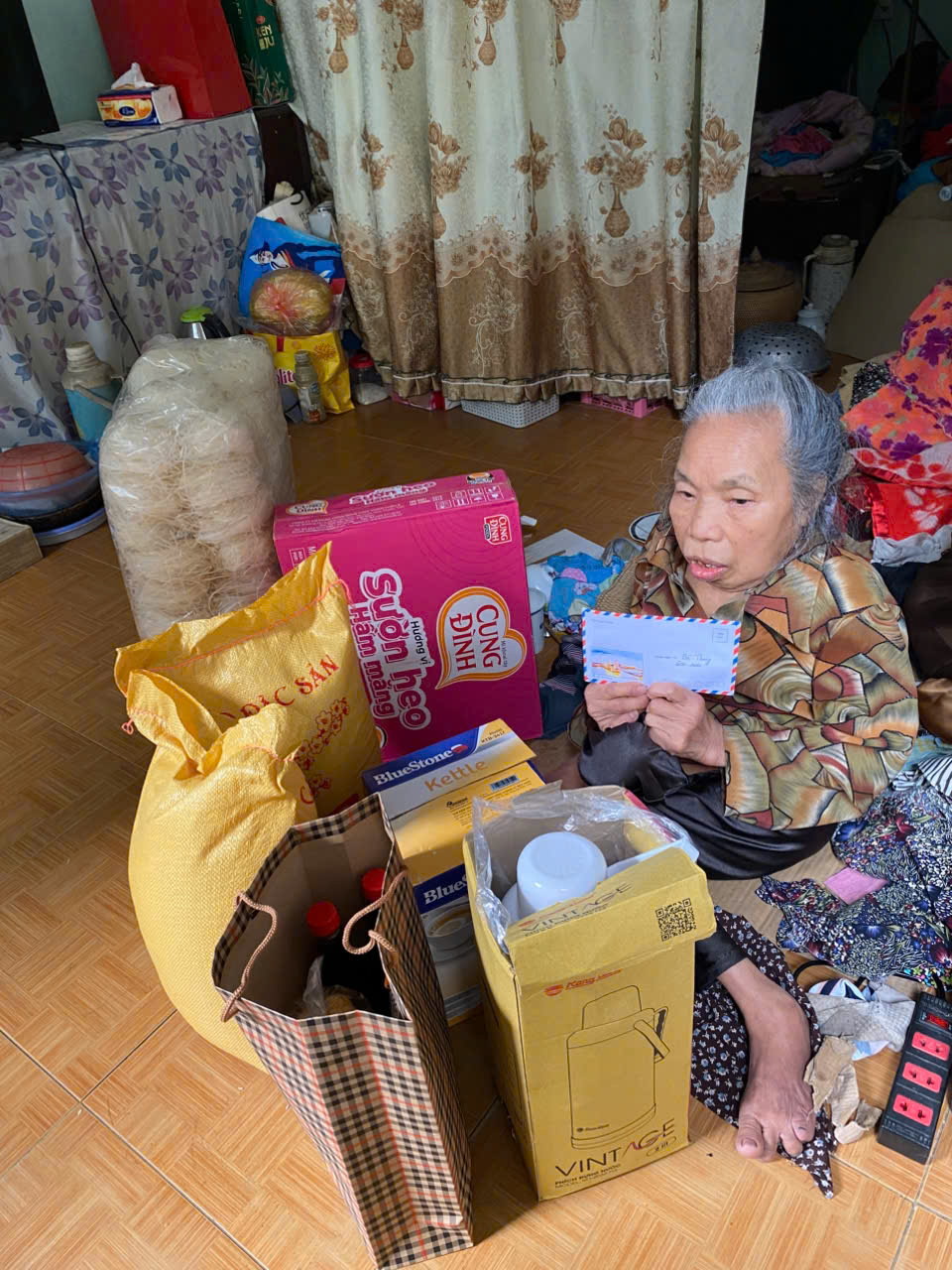 11. Bà Nguyễn Thị Thùy (77 tuổi) *** Bà bị tàn tật từ nhỏ, bà sống một mình, không có người thân cận bên cạnh. Bà phải tự lo mọi sinh hoạt hằng ngày, mặc dù rất khó khăn. Mỗi khi trời chuyển lạnh, nhất là vào mùa đông, bà đau nhức khắp người, từ các đầu ngón tay, ngón chân cho đến toàn thân. Việc di chuyển rất khó: bà phải dùng hai tay và phần mông để lê đi từng chút. Vì sức yếu, bà không có điều kiện chuẩn bị bữa ăn đầy đủ chất, thường chỉ ăn qua loa với những món tiện lợi. Năm nay, sức khỏe bà yếu hơn nhiều so với năm trước, nói năng cũng hụt hơi.