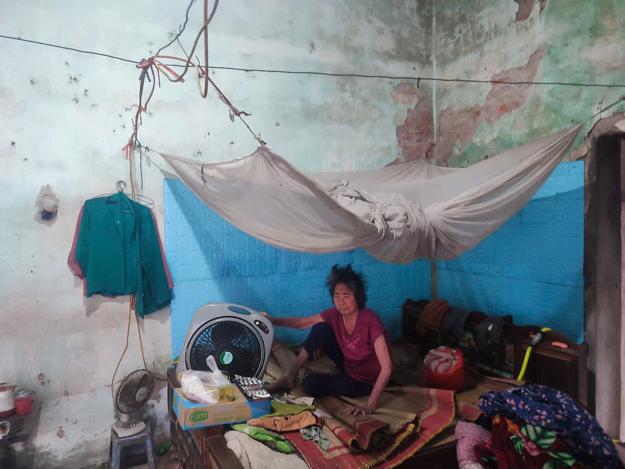 8. Bà Nguyễn Thị Mùi (72 tuổi) *** Bà bị tai biến và có vấn đề thần kinh nặng. Chân tay co quắp, không thể đi lại, suốt ngày ngồi một chỗ và nói lảm nhảm. Mọi sinh hoạt của bà đều do chồng già chăm sóc. Trong gia đình còn có một người con gái lớn tuổi nhưng không được minh mẫn.