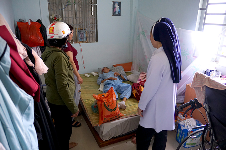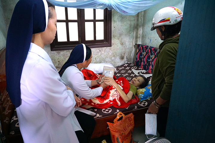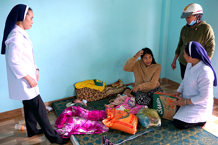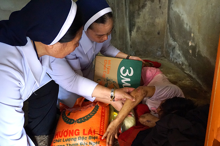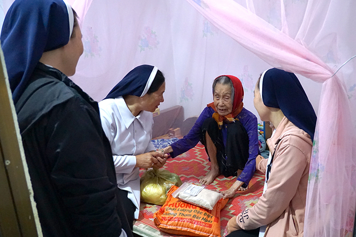 Với một số ít bà con dân tộc H’Mông, các Sơ tập trung họ lại một địa điểm để trao quà. Tuy nhiên, phần lớn trường hợp, các Sơ phải trực tiếp đến từng nhà để trao tận tay vì đa số những người này không còn khả năng di chuyển. Họ là những cụ già yếu, người bệnh tật, khuyết tật hoặc tâm thần.